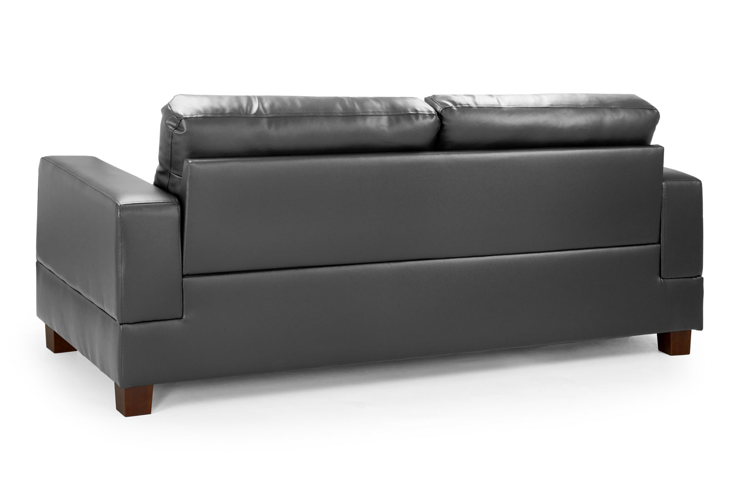 The Jerry Black Leather 3 Seater Sofa offers generous seating with its simplistic yet stylish design. The boxy silhouette is enhanced by soft, plump cushions, providing both comfort and support in a sophisticated black faux leather finish.