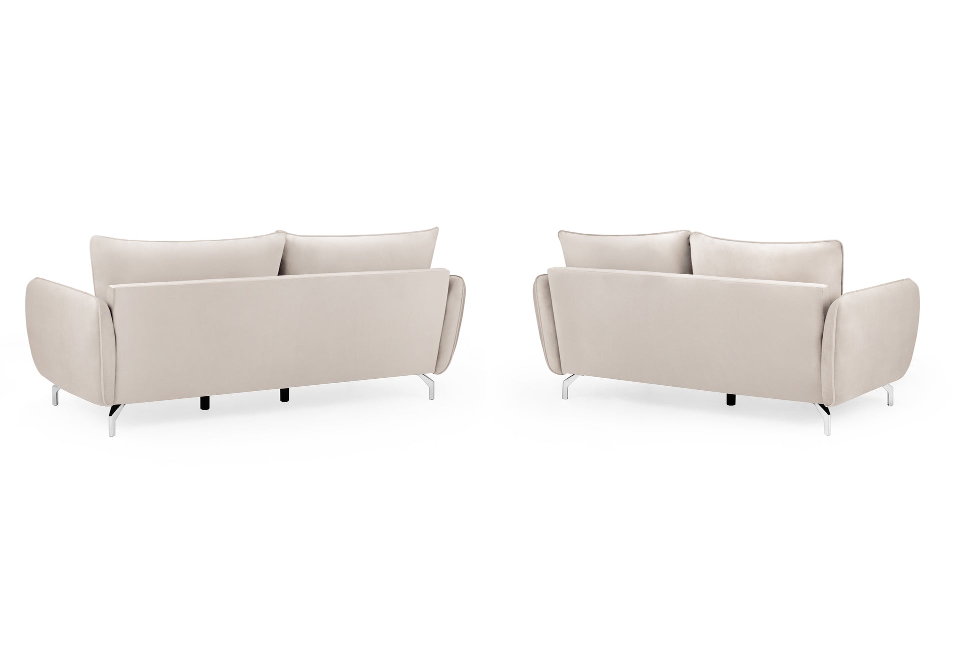 The Lavard Beige Velvet 3 and 2 Seater Sofa Set offers a comprehensive seating arrangement for your living space. Both sofas feature the same luxurious velvet upholstery and modern design elements.
