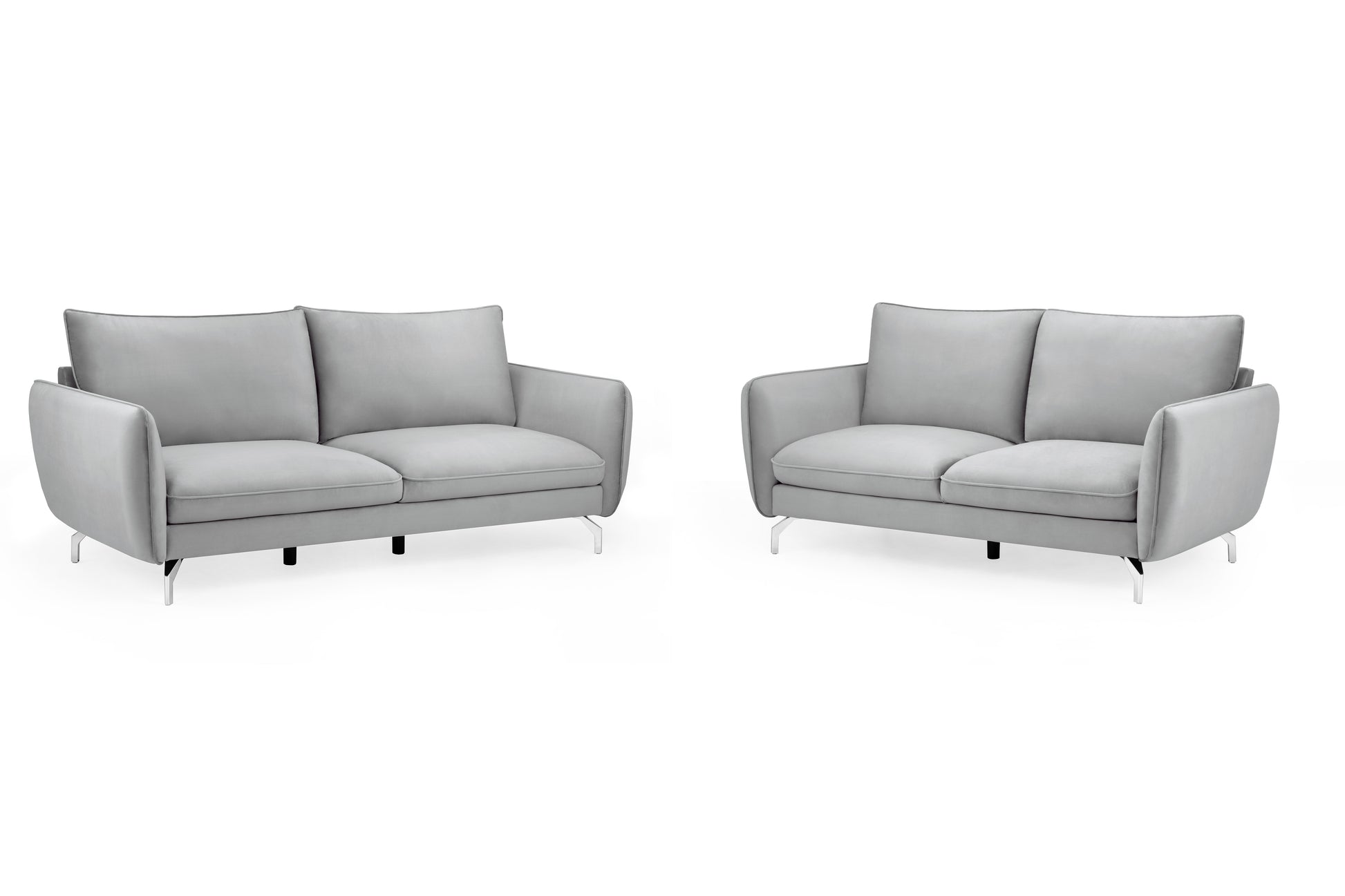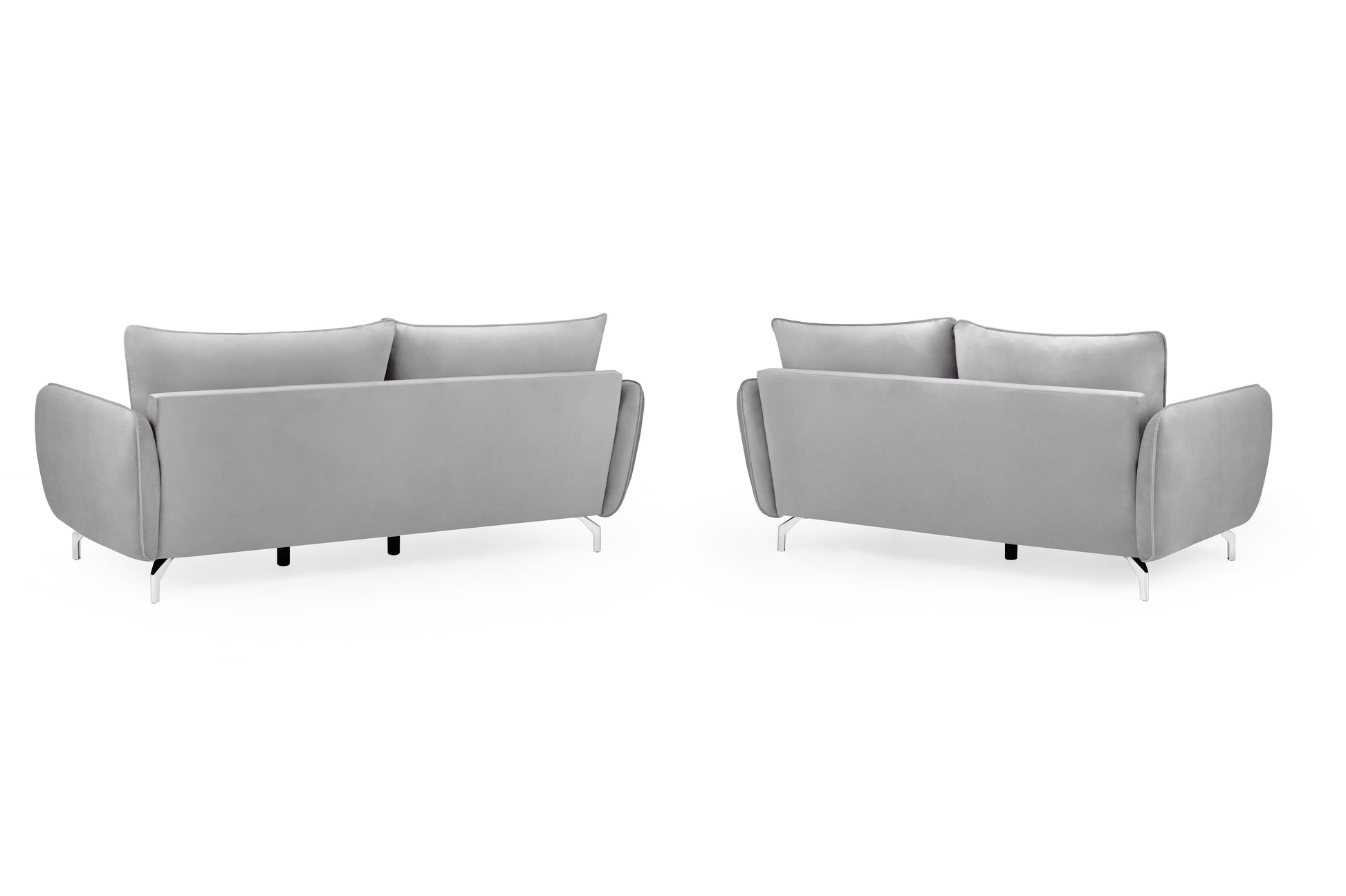 The Lavard Grey Velvet 3 and 2 Seater Sofa Set offers a comprehensive seating arrangement for your living space. Both sofas feature the same luxurious velvet upholstery and modern design elements.