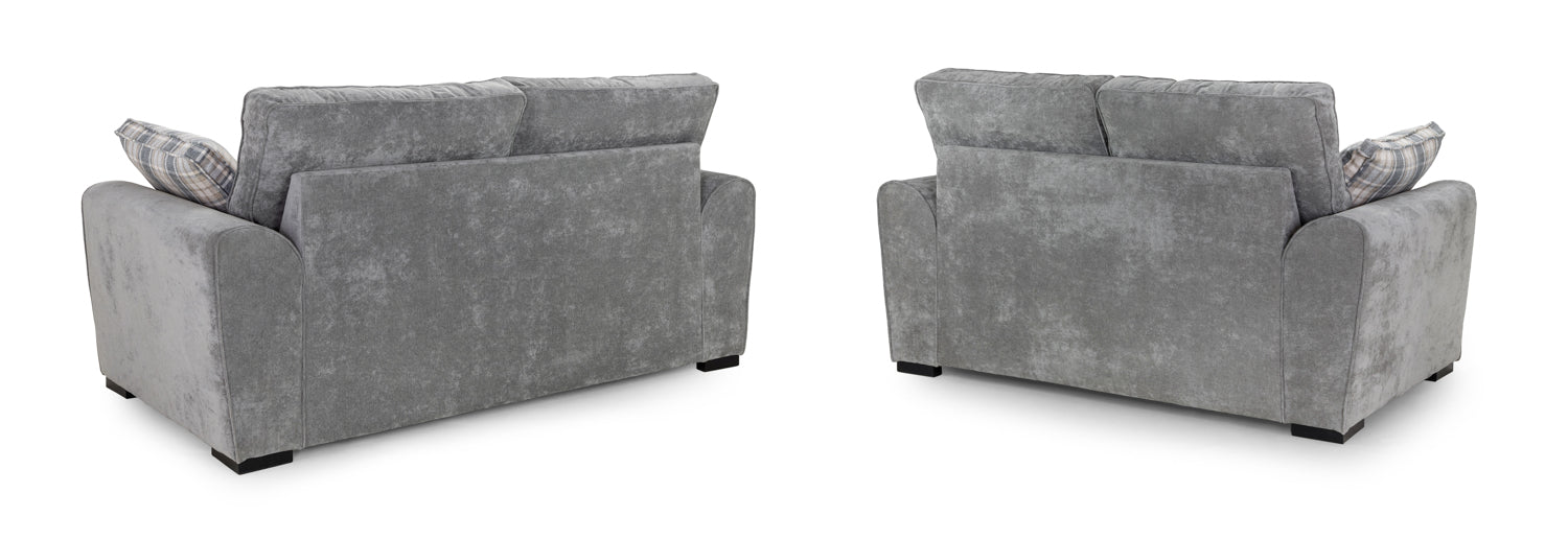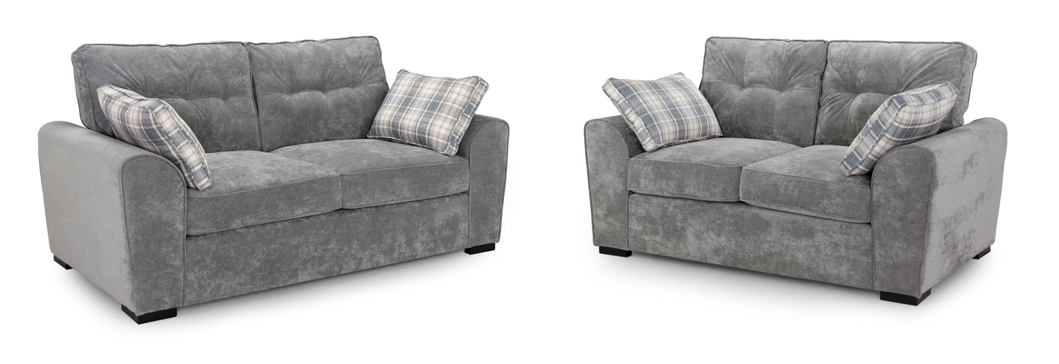 The Maxwell Grey Fabric 3 and 2 Seater Sofa Set offers a comprehensive seating arrangement for your living space. Both sofas feature the same trendy grey fabric, patterned cushions, and inviting aesthetic for a cohesive look.