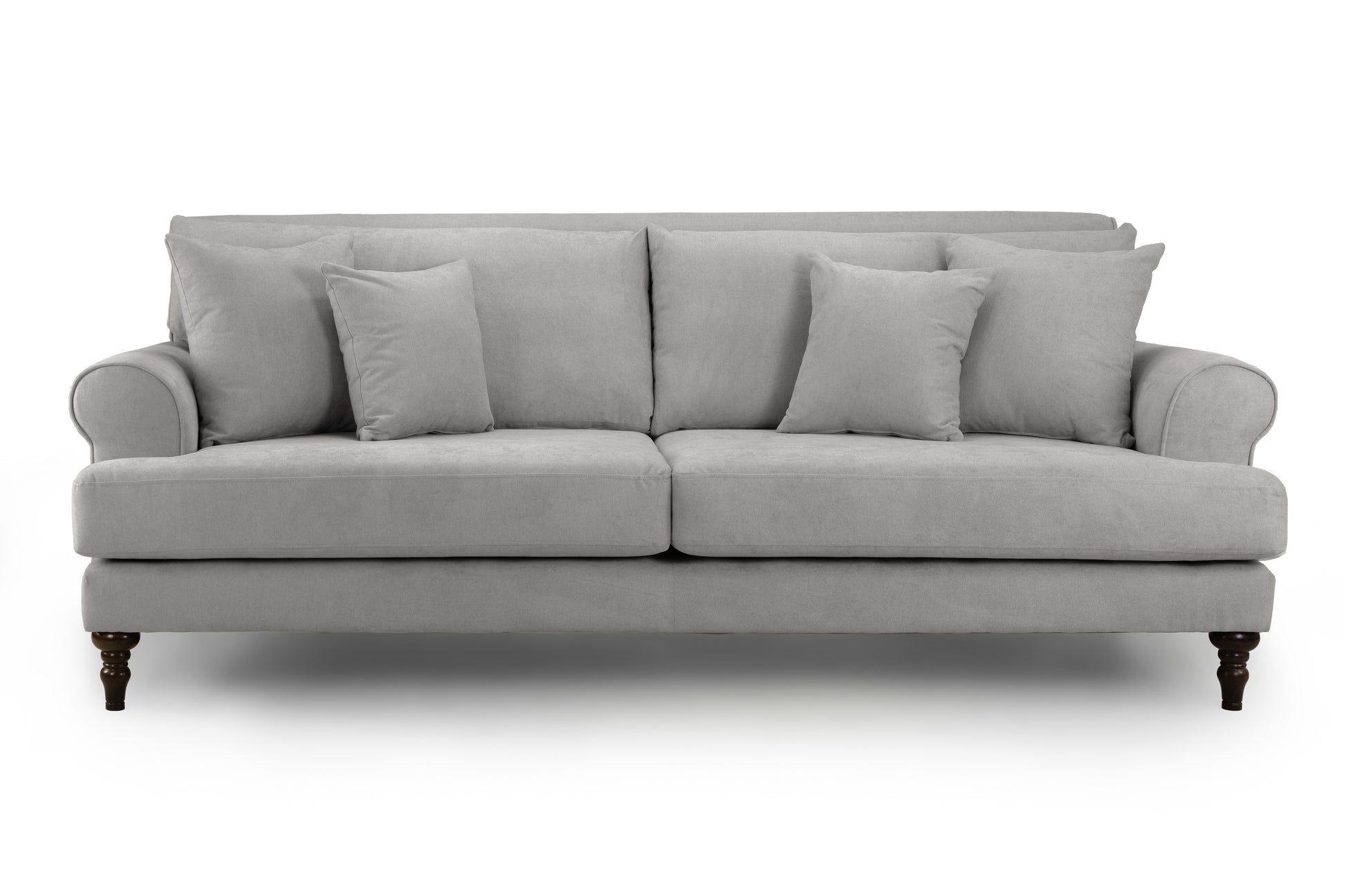 The Summer Grey Fabric 4 Seater Sofa combines timeless elegance with spacious comfort. Ideal for large families or those who love to entertain, this sofa features scrolled arms, turned wooden feet, and remarkably soft cushions for a touch of sophistication and relaxation.