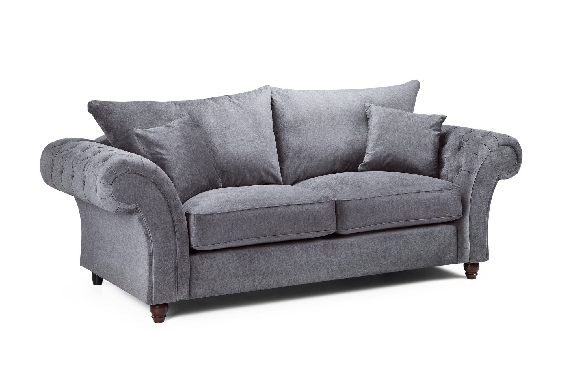 The Windsor Grey Fabric 3 Seater Sofa offers a perfect blend of style and comfort. Its soft polyester upholstery, luxury foam cushions, and button-tufted scroll arms create an inviting atmosphere in any living room.