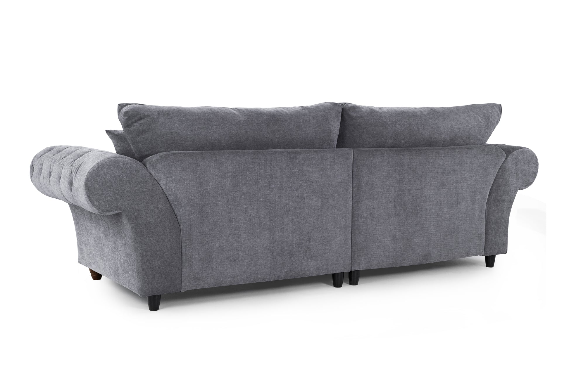 The Windsor Grey Fabric 4 Seater Sofa combines timeless style with ample seating space. Its soft polyester upholstery, luxury foam cushions, and button-tufted scroll arms create an inviting and comfortable atmosphere.